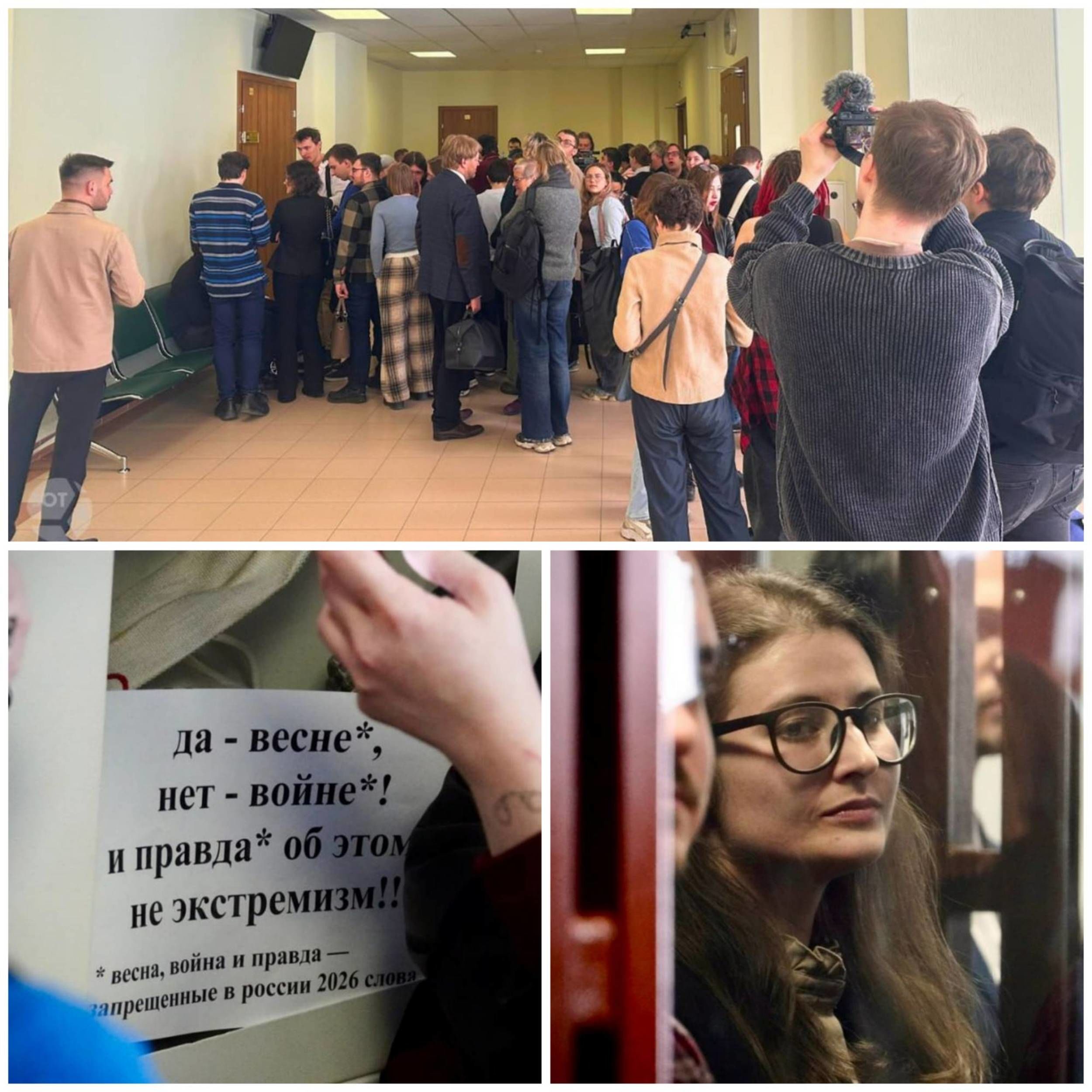 Na fotografii: nahoře část publika, která přišla podpořit aktivisty při vynesení rozsudku. Dole vlevo: plakát s nápisem „Ano jaru, ne válce, pravda není extremismus. Poznámka: slova „jaro“, „válka“ a „pravda“ jsou v Rusku v roce 2026 zakázána.“ Dole vpravo: Anna Archipova. Foto: SOTA Vision.