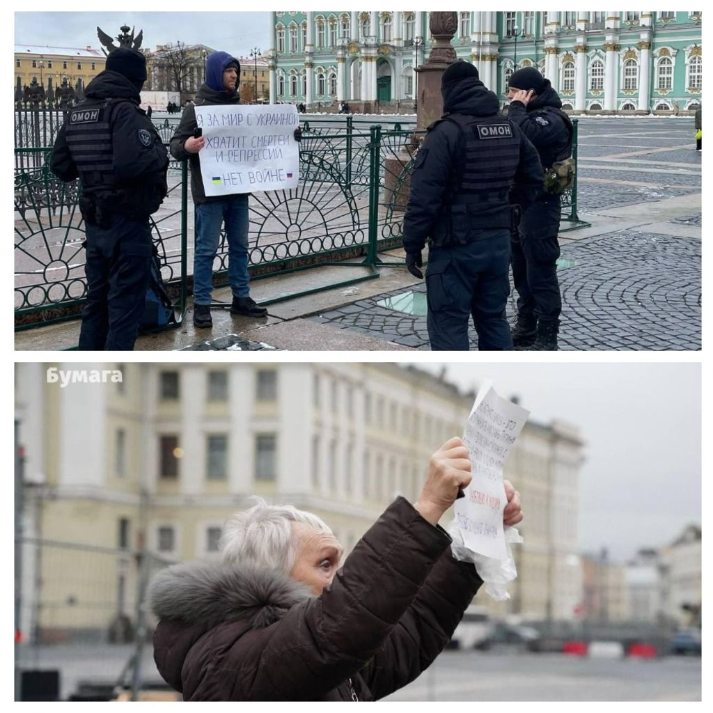 Otevřená kritika války s sebou nese mnohem větší rizika a lidé s podobnými transparenty zpravidla čelí zadržení, pokutám a dalším formám stíhání. Například 18. listopadu vyšel aktivista Alexandr Pirogov na hlavní náměstí Petrohradu s plakátem s textem „Jsem pro uzavření míru s Ukrajinou. Dost bylo smrtí a represí. Ne válce“. Po zhruba 25 minutách byl zadržen a následně s ním byl sepsán protokol o údajné diskreditaci ruské armády. Do centra Petrohradu v listopadu vyrazila s protiválečným transparentem také 84letá Ljudmila Vasiljeva, která zločiny ruské vlády kritizuje pravidelně. Zadržena byla prakticky okamžitě; po několika hodinách ji policie naštěstí propustila.