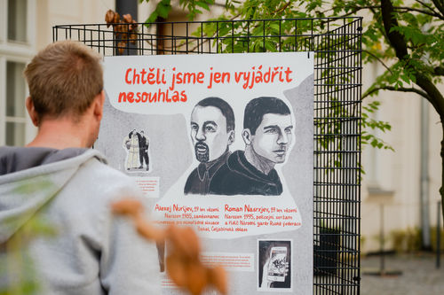 The exhibition was first presented on September 30, 2024 in the Valdštejnská zahrada in Prague and its guest of honor was human rights activist and member of the Memorial organization Oleg Orlov, who was only recently released from Russian prison. He then helped us install the exhibition on the Republic Square in Prague in November 2024 and symbolically installed a panel with his own story, which is also part of the exhibition.